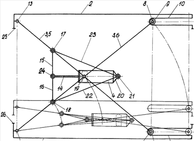 Основание 20 силового гидроцилиндра 4 осью 21 и дополнительной парой тяг 22 и 23 соединено с осями 17 и 18 на верхнем и нижнем плечах пересекающихся рычагов 5, 6.