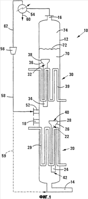 Легкие углеводородные продукты, такие как C20 и более низкие фракции, отводятся из реактора через выпускное отверстие 16 и направляются в блок сепарации 54. Обычно блок сепарации 54 включает ряд холодильников и парожидкостной сепаратор, и, возможно, может включать дополнительные холодильники и сепараторы, а также криогенное устройство для удаления водорода, монооксида углерода, метана и диоксида углерода из C20 и более низких углеводородных фракций. Можно использовать и другие технологии разделения, такие как метод мембранных блоков, качающие адсорбционные модули и/или блоки удаления углекислого газа. Разделенные газы, содержащие водород, монооксид углерода и другие газы, подвергаются сжатию и повторному использованию с помощью компрессора 56, создающего поток рециркулированного газа. Конденсированные жидкие углеводороды и реакционная вода отводятся из блока сепарации 54 с помощью линии потока 60 для последующего смешивания.