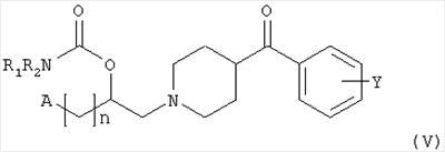 2. Рацемическое или энантиомерно обогащенное производное O-карбамоилбензоилпиперидина, представленное структурной формулой (V):