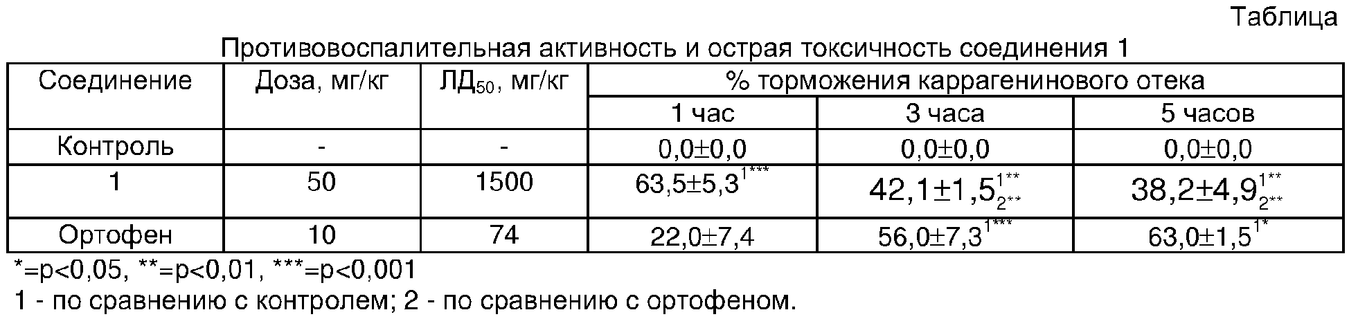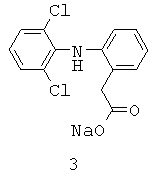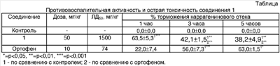 Структурный аналог 2 обладает слабым противовоспалительным действием, недостаточным для практического здравоохранения. Эталоном сравнения выбрана натриевая соль 2-[(2,6-дихлорфенил)-амино]-фенилуксусной кислоты (ортофен) (3) формулы: