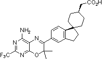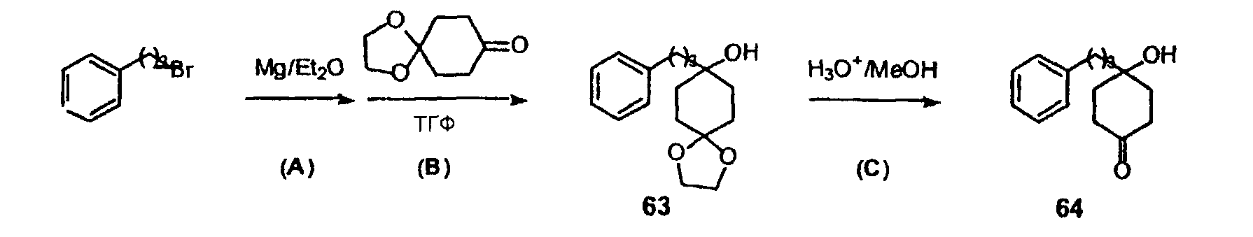 Подобным образом, заместители для групп арила и гетероарила являются разнообразными и выбраны из галогена, -OR’, -OC(O)R’, -NR’R”, -SR’, -R’, -CN, -NO2, -CO2R’, -CONR’R”, -C(O)R’, -OC(O)NR’R”, -NR”C(O)R’, -NR”CO2R’, -NR’-C(O)NR”R”‘, -NR’-SO2NR”R”‘, -NH-C(NH2)=NH, -NR’C(NH2)=NH, -NH-C(NH2)=NR’, -S(O)R’, -SO2R’, -SO2NR’R”, -NR”SO2R’, -N3, -CH(Ph)2, перфтор(C1-C4)алкокси и перфтор(C1-C4)алкила, в пределах их числа от нуля до суммарного числа открытых валентностей на ароматической кольцевой системе; и где R’, R” и R”‘ независимо выбраны из водорода, (C1-C8)алкила и гетероалкила, незамещенного арила и гетероарила, (незамещенный арил)-(C1-C4)алкила и (незамещенный арил)окси-(C1-C4)алкила. Когда арильной группой является 1,2,3,4-тетрагидронафталин, он может быть замещен замещенной или незамещенной (C3-C7)спироциклоалкильной группой. (C3-C7)спироциклоалкильная группа может быть замещена таким же образом, как определено здесь для “циклоалкила”. Обычно арил или гетероарильная группа будет иметь от нуля до трех заместителей, причем эти группы, имеющие два или менее заместителей, предпочтительны в данном изобретении. В одном варианте изобретения группы арил или гетероарил будут незамещенными или монозамещенными. В другом варианте группы арил или гетероарил будут незамещенными. Когда они замещенные, указанные выше заместители могут быть присоединены к арилу или гетероарильной группе через спейсер из одного-четырех атомов углерода, обычно представленной как группы метилена или разветвленного незамещенного алкилена (например, -CH2CH2– и -CH(CH3)CH2-).