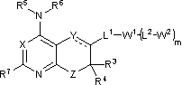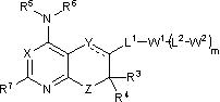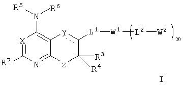 Пунктирная линия указывает возможную связь. В других возможных вариантах R3 и R4 могут быть объединены с образованием 3-, 4-, 5- или 6-членного спирокольца; R2, R3 или R4 могут быть объединены с W1 с образованием 5-, 6- или 7-членного конденсированного кольца, имеющего от 0 до 3 гетероатомов, выбранных из группы, состоящей из N, O и S; R5 и R6 могут быть быть объединены с атомом азота, к которому каждый присоединен, с образованием 5-, 6- или 7-членного кольца; когда X означает C(R1), R5 или R6 может быть объединен с R1 с образованием 5-, 6- или 7-членного конденсированного кольца, содержащего атом азота, к которому R5 или R6 присоединен; когда Х означает C(R1), R7 может быть объединен с R1 с образованием 5-, 6- или 7-членного конденсированного кольца; R2 или R1, когда присутствует как часть Y, может быть объединен с R5 с образованием 5- или 6-членного кольца с атомом азота, к которому R5 присоединен, необязательно несущим оксогруппу; и когда m означает 1 и L2 означает связь, заместитель на W2 может быть объединен с заместителем на W1 с образованием 5-, 6- или 7-членного кольца, конденсированного с W1 и образующего спиросистему или конденсированного с W2, где кольцо является насыщенным или ненасыщенным и имеет 0, 1 или 2 гетероатома, выбранных из N, O и S, в качестве членов кольца.