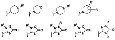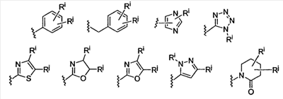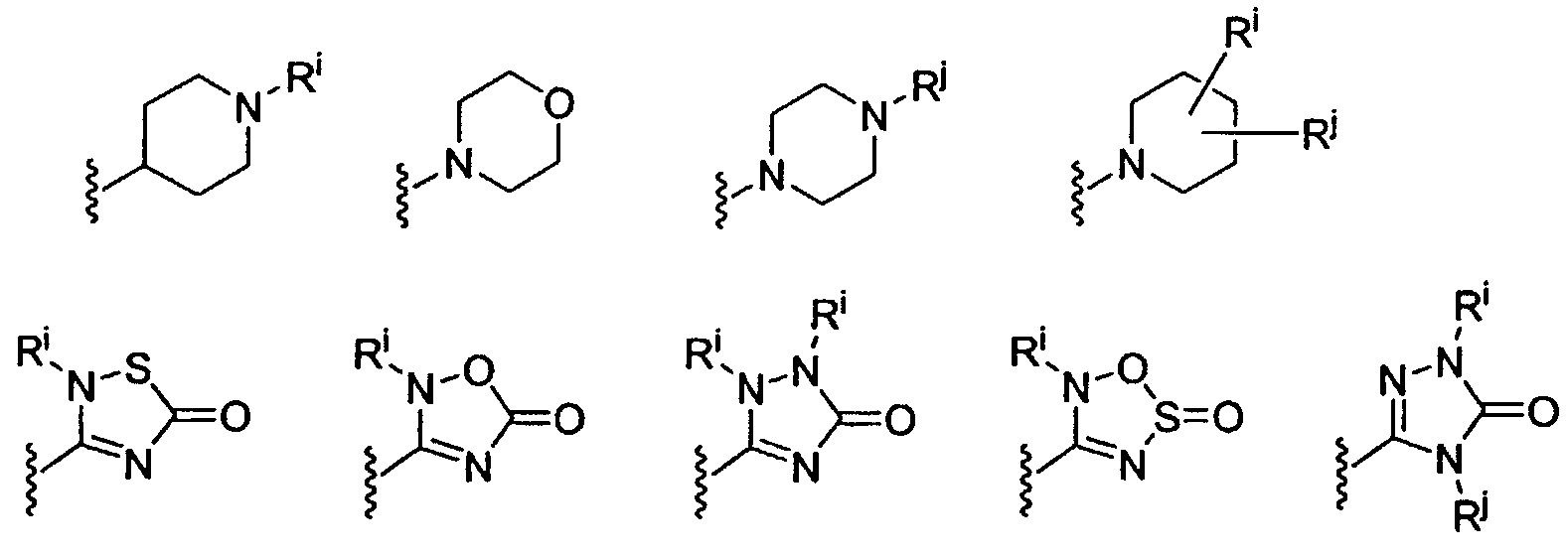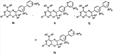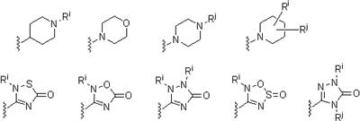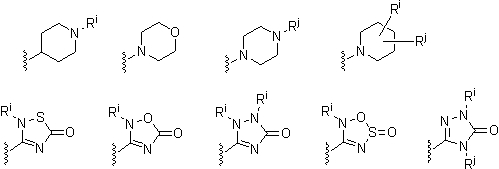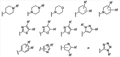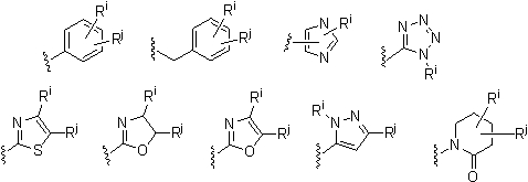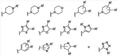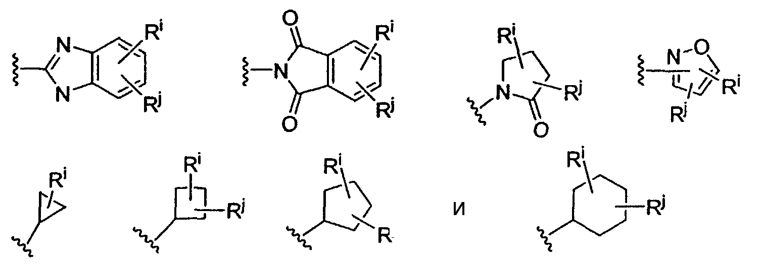 -Т-С(О)-(CH2)q-U-, где Т и U независимо означают -NH-, -О-, -CH2– или ординарную связь, и q означает целое число от 0 до 2. В качестве варианта, два заместителя на соседних атомах кольца арила или гетероарила необязательно могут быть замещены заместителем формулы -А-(СН2)r-В-, где А и В независимо означают -СН2-, -О-, -NH-, -S-, -S(O)-, -S(O)2-, -S(O)2NR’- или одинарную связь, и r означает целое число от 1 до 3. Одна из одинарных связей образованного таким образом нового кольца необязательно может быть замещена двойной связью. В качестве варианта, два заместителя на соседних атомах кольца арила или гетероарила необязательно могут быть замещены заместителем формулы -(CH2)s-X-(CH2)t-, где s и t независимо означают целые числа от 0 до 3, и Х означает -O-, -NR’-, -S-, -S(O)-, -S(O)2-, или -S(O)2NR’-. Заместитель R’ в -NR’- и -S(O)2NR’- выбран из водорода или незамещенного (C1-C6)алкила.