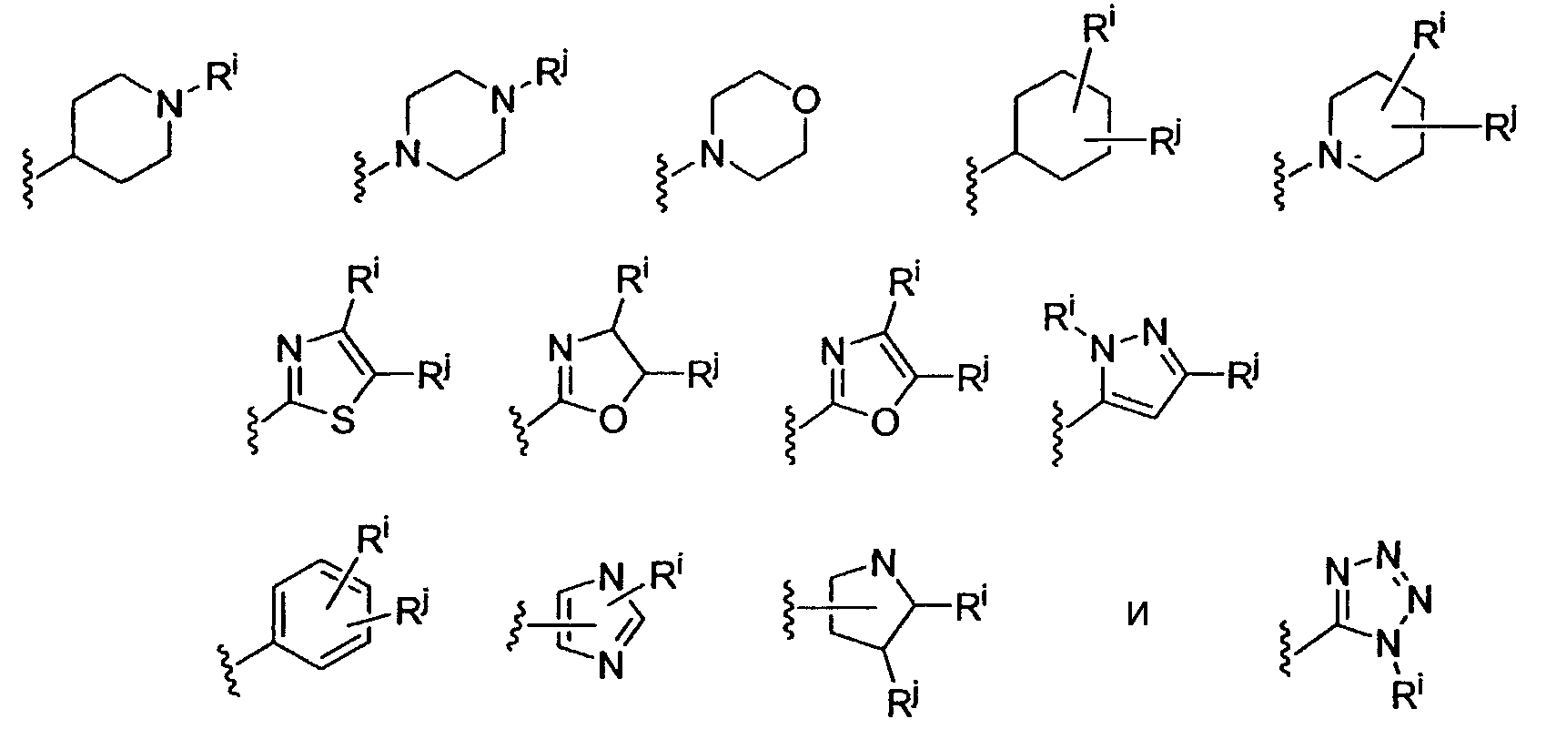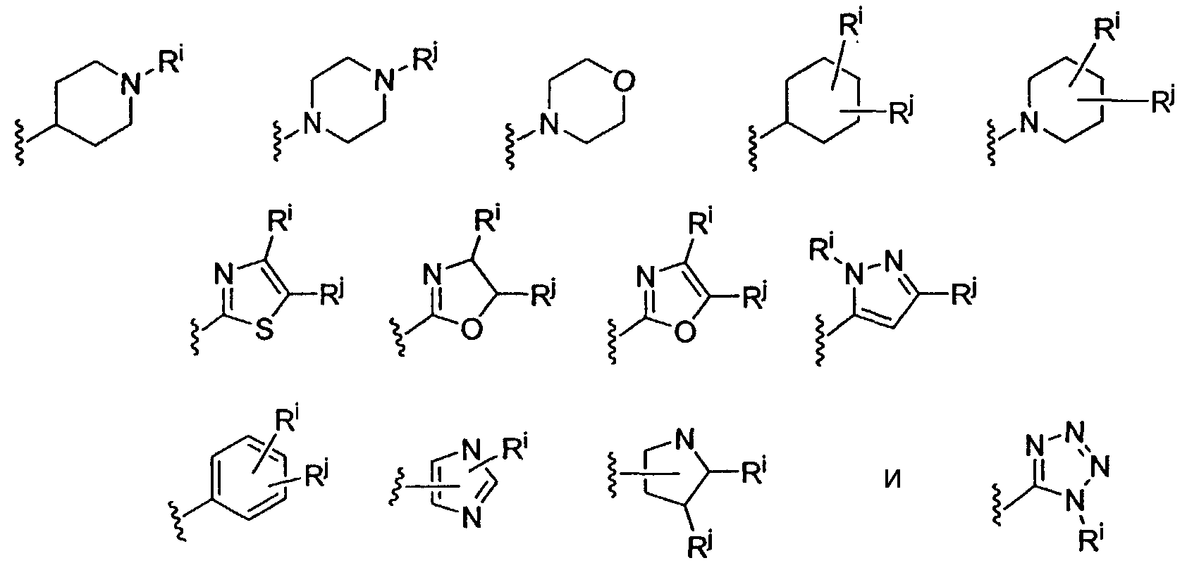 Пунктирная линия указывает возможную связь. В других возможных вариантах, R3 и R4 могут быть объединены с образованием 3-, 4-, 5- или 6-членного спирокольца; R2, R3 или R4 может быть объединен с W1 с образованием 5-, 6- или 7-членного конденсированного кольца, имеющего от 0 до 3 гетероатомов, выбранных из группы, состоящей из N, O и S; R5 и R6 могут быть объединены с атомом азота, к которому каждый присоединен, с образованием 5-, 6- или 7-членного кольца; R2 или R1, когда присутствует как часть Y, может быть объединен с R5 с образованием 5- или 6-членного кольца с атомом азота, к которому R5 присоединен, необязательно несущим оксогруппу; когда Х означает C(R1), R5 или R6 может быть объединен с R1 с образованием 5-, 6- или 7-членного конденсированного кольца, содержащего атом азота, к которому R5 или R6 присоединен; и когда Х означает C(R1), R7 может быть объединен с R1 с образованием 5-, 6- или 7-членного конденсированного кольца.