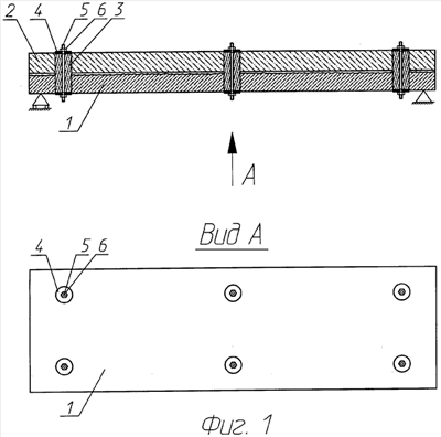 на фиг.1 изображена конструкция, усиленная способом увеличения рабочего сечения с применением сборного железобетонного элемента шпонок из бетона, подвергнутых обжатию в процессе твердения и устроенных под углом 90° к поверхности усиливаемого элемента, где 1 – усиливаемая железобетонная конструкция, 2 – сборный элемент усиления, 3 – шпонка из бетона, подвергнутая обжатию в процессе твердения, 4 – металлическая шайба, 5 – металлическая шпилька, 6 – гайка;