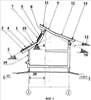 Кроме того, на чертежах показаны: нижняя плоскость ската кровли, обращенного на север (12), размещенная под углом к горизонту (13), величиной от 12 и не более 26,5°; с козырьком (14), выступающим за плоскость наружных стен не более чем на четвертую часть их высоты, светоотражающее покрытие (15) нижней плоскости обращенного на юг ската кровли, большая по протяженности продольная ось здания (16), вытянутая с востока на запад, ограниченная максимальным отклонением до 20° к северу и югу от указанного направления, торцевые стены здания (17) и угол их пересечения в горизонтальной плоскости (18) с продольной осью здания (16), составляющий не менее 60, но и не более 90°, а также оконные проемы (19), площадь которых принята не менее 60% от площади стен, ориентированных на южный, западный и восточный сектора горизонта, и не более 30% от площади стен, ориентированных на северный сектор горизонта, при этом не менее 30% от суммарной площади указанных оконных проемов выполнены вентилируемыми, сквозное от пола до конька кровли вертикальное пространство (20) площадью в горизонтальном сечении не более 50% от площади здания в границах наружных стен.