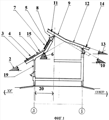 Кроме того, решению технической задачи способствуют двучастное деление ската кровли, обращенного на север, при котором его нижняя плоскость (12) и козырек (14) размещены под углом в вертикальной плоскости к горизонту (13), что согласно законам аэродинамики препятствует отрыву набегающего с севера ветрового потока от плоскости кровли; светоотражающее наружное покрытие (15), повышающее КПД солнечных коллекторов водяного отопления (7) при их дополнительном облучении отраженными от покрытия солнечными лучами, при низком угле стояния солнца над горизонтом зимой; максимальное отклонение большей по протяженности продольной оси здания (16), вытянутой с востока на запад, до 20° к северу и югу от указанного направления, что обеспечивает наибольшее поступление солнечного тепла через оконные проемы (8) и (19) зимой; величина угла (18) пересечения торцевых стен здания (17) с его продольной осью (16) в горизонтальной плоскости, способствующая образованию зоны ветрового затишья с южной стороны здания при набегающем ветровом потоке с севера, ограничение площади оконных проемов (19) в зависимости от их ориентации, способствующее увеличению количества солнечного тепла, поступающего в помещения с юга, и сокращению теплопотерь через проемы, ориентированные на север, а также ограничение минимальной площади вентилируемых через открытые створки оконных проемов (19), размещение вентилируемых через открытые створки оконных проемов (8) в верхней плоскости южного ската кровли и формирование в границах наружных стен здания сквозного от пола до конька кровли вертикального пространства (20), способствующих обеспечению комфортного теплового режима жилых помещений днем в период года со среднесуточной температурой воздуха выше +20°С посредством естественной аэрации.