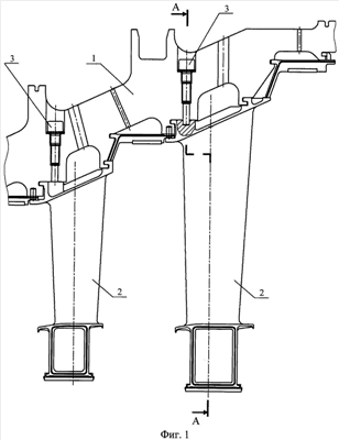 В корпусе 1 установлены блоки направляющих лопаток 2. Блоки зафиксированы в корпусе элементами фиксации, например штифтами 3. Между блоками направляющих лопаток 2 установлены уплотнительные пластины 4. В зоне горизонтального разъема установлены блоки направляющих лопаток 5 и 6.