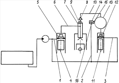 Система содержит трубопроводы низкого давления 1, 2 и 3, топливный насос высокого давления 4 с нагнетательным клапаном 5, трубопровод высокого давления 6, форсунку 7, невозвратный клапан 8, размещенный в дополнительном канале 9, причем дополнительный канал 9 одним концом связан с трубопроводом высокого давления 6, а другим – с подпитывающей магистралью 10. Подпитывающая магистраль 10 соединяет вспомогательный топливный насос высокого давления 11 с невозвратным клапаном 8 через аккумулятор высокого давления. Насос 11 связан через трубопровод 3 с трубопроводом 1. В насосе 11 размещен нагнетательный клапан 12, а на аккумуляторе высокого давления 13 установлен редукционный клапан 14, состоящий из шарика 15 и пружины 16. Редукционный клапан 14 соединен посредством трубопровода 2 с трубопроводом 3. Вспомогательный топливный насос высокого давления 11 предназначен для подачи топлива под высоким давлением в аккумулятор высокого давления 13. Редукционный клапан 14 ограничивает давление топлива в аккумуляторе высокого давления 13. Редукционный клапан 14 отрегулирован на давление, которое на 20% меньше давления посадки иглы форсунки 7 в седло. Например, для дизеля КамАЗ-740.10 давление посадки иглы форсунки в седло составляет 10 МПа [2]. В этом случае редукционный клапан 14 должен быть отрегулирован на давление 8 МПа с целью компенсации возможных скачков давления топлива в трубопроводе высокого давления 6.