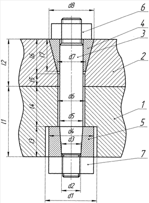 В детали 2 выполнено коническое отверстие с диаметрами d6 и d8, в котором установлена коническая разрезная втулка 4 с диаметрами d7 и d8 под посадку шпильки 3 с натягом на участке l7.