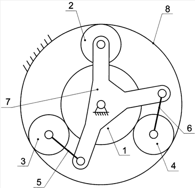 Как следует из чертежа, неподвижным центральным колесом с внутренним зацеплением является колесо 8. Подвижным центральным колесом является колесо 1 с внешним зацеплением. Основной сателлит 2 соединен в шарнир с водилом 7, пассивные сателлиты 3 и 4 соединены с водилом 7 через посредство дополнительных шатунов 5 и 6, которые как с сателлитами 3 и 4, так и с водилом 7 соединены в шарниры. Благодаря такому соединению пассивные сателлиты 3 и 4 имеют возможность самоустанавливаться относительно ведущего колеса 1 и неподвижного колеса 8.