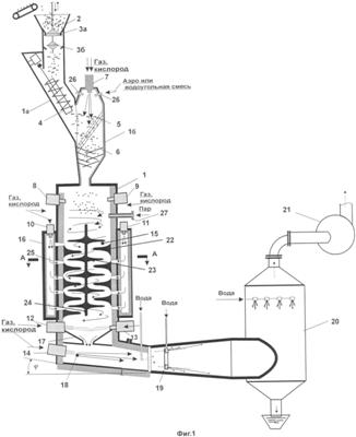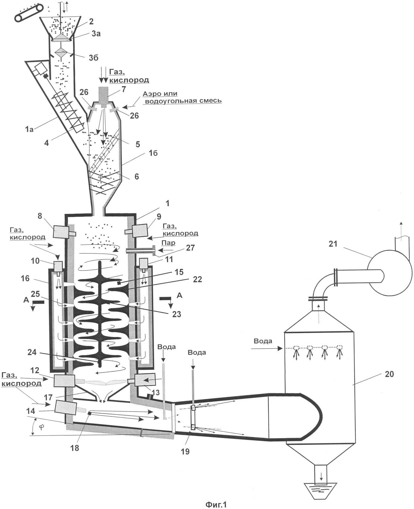 Газификатор содержит цилиндрический корпус 1, в верхней части которого он имеет наклонную часть 1а, врезанную в вертикальную часть 1б. В наклонной части корпуса 1 установлен загрузочный бункер 2, соединенный с шлюзовым устройством с шлюзовыми элементами 3а и 3б и питательным шнеком 4. В вертикальной части корпуса 1б, под шнеком 4 закреплена наклонная решетка 5, установленная с перекрытием пространства вертикальной части корпуса, и множество ударных штырей 6, расположенных под решеткой с перекрытие внутреннего пространства этой части корпуса 1. Газификатор также снабжен камерами сжигания 7, 8, 9, 10, 11, 12, 13, 14. Камера сжигания 7 расположена на торце верхней вертикальной части 1б. Камеры сжигания 8, 9 тангенциально расположены на выходе из вертикальной части корпуса над входом в проточные секции 15. Камеры сжигания 10, 11, расположены на коллекторе 16, который может быть снабжен охлаждающей рубашкой (условно не показана). Камеры сжигания 12, 13 тангенциально расположены на выходе из проточных секций 15 и над входом в коническую выпускную часть 17 корпуса 1. Камера сжигания 14 расположена на торце полуоткрытого канала 18, который подключен к скрубберу Вентури 19. Скруббер Вентури тангенциально подключен к сепаратору 20, верх которого подключен к дымососу 21, а низ снабжен гидрозатвором. Секции 15 образованы дефлекторами 22 и 23, выполненным, например, из стали, ошипованной и покрытой огнеупорной обмазкой, что также касается и всех других огневых поверхностей. Дефлекторы 22 выполнены в виде кольцевых экранов, закрепленных на внутренней поверхности газификатора. Дефлекторы 23 выполнены в виде центральных тарельчатых экранов, закрепленных на общем для всех секций и соосно расположенном центральном теле 24, закрепленном по оси цилиндрической части корпуса 1. Между дефлекторами 22 и 23 образованы проходные зазоры, величина которых должна обеспечивать свободное прохождение через них обрабатываемого материала. Коллектор 16 сообщен с реакционным пространством секций 15 посредством тангенциальных сопел 25, расположенных по высоте на уровнях этих секций и спутно по отношению к направлению закрутки вихревого потока. Для интенсификации диспергирования сопла 25 могут быть выполнены в виде струйных генераторов колебаний типа сопел Гартмана. (Для сведения, струйные генераторы ультразвуковых волн нашли широкое применение в технике, см., например, книгу «Применение пульсирующего дутья при производстве стали», Москва, Металлургия 1885 г., с 113.)
