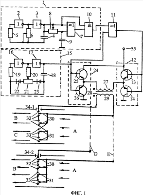 Схема электрическая принципиальная биполярного генератора ионов представлена на фиг.1, где использованы стандартные обозначения элементов. Здесь блок управления концентрацией ионов 1 содержит классический высокочастотный мультивибратор, собранный на инверторах 2 и 3, где выход инвертора 3 через последовательно соединенные времязадающий конденсатор 4 и развязывающий резистор 5 соединен с входом инвертора 2, а общая точка инверторов 2 и 3 подключена к общей точке конденсатора 4 и резистора 5 через потенциометр 6, включенный в реостатном режиме (подробное описание принципов построения и работы такого мультивибратора смотри в книге: Р.Мелен, Г.Гарланд. Интегральные микросхемы на КМОП-структурах. М., «Энергия», 1979 г., стр.105-107, рис.6-1.). Выход инвертора 3, являющийся выходом мультивибратора, соединен со входом формирователя импульсов по фронту выходных импульсов мультивибратора, выполненного на логическом элементе «ИСКЛЮЧАЮЩЕЕ ИЛИ» 7, первый вход которого является входом формирователя, к которому через потенциометр 8 в реостатном включении подсоединен второй вход элемента 7, соединенный дополнительно через времязадающий конденсатор 9 с общей шиной. Выход логического элемента 7 и его первый вход соединены с разными входами логического элемента «2И» 10, выход которого является выходом блока управления концентрацией ионов 1. Если первый вход логического элемента 10 переключить с выхода инвертора 3 на его вход, то на выходе элемента 10 будут появляться импульсы, сформированные не по фронту, а по спаду выходных импульсов мультивибратора [Подробно такой формирователь импульсов описан в SU 1 283 953 А1, 15.01.1987 (В.П.Реута, В.Б.Иванов)]. Выход блока управления концентрацией ионов 1 соединен с первым входом логического элемента «ИСКЛЮЧАЮЩЕЕ ИЛИ» 11, исполняющего роль узла управления полярностью высоковольтных импульсов, выход которого подключен к первому входу мостового переключателя напряжения, в котором роль правого по схеме плеча играет комплементарный эмиттерный повторитель 12,собранный на комплементарной паре транзисторов Дарлингтона 13 и 14. (О транзисторах Дарлингтона смотри: Клод Галле. Полезные советы по разработке и отладке электронных схем. М., «ДМК», 2003 г., стр.63, рис.2-27. 3десь же на стр.106-107 и на рис.2.67 помещена информация о комплементарных эмиттерных повторителях.) Второй вход логического элемента 11 подключен к выходу низкочастотного генератора импульсов 15, собранного на двух последовательно соединенных инверторах 16 и 17, где выход инвертора 17 через последовательно соединенные времязадающий конденсатор 18 и развязывающий резистор 19 подключен ко входу инвертора 16, а общая точка инверторов 16 и 17 через токоограничивающий резистор 20 соединена с движком потенциометра 21, один крайний вывод которого через прямовключенный диод 22, а другой – через обратновключенный диод 23 подключены к общей точке конденсатора 18 и резистора 19 [разные варианты построения генераторов импульсов с регулируемой скважностью импульсов описаны в SU 1 132 340 А, 30.12.1984 (В.П.Реута)]. Выход инвертора 17, являющийся выходом генератора 15, соединен со вторым входом мостового переключателя напряжения, роль левого по схеме плеча которого исполняет комплементарный эмиттерный повторитель 24, собранный на комплементарной паре транзисторов Дарлингтона 25 и 26. Между выходами правого 12 и л
