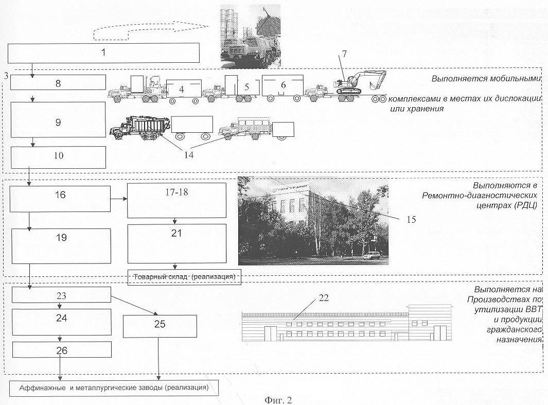 На фиг.1 представлен чертеж, поясняющий сущность предлагаемого способа утилизации изделий, не содержащих взрывоопасных, радиационно-опасных, биологически опасных и химически опасных элементов, на фиг.2 – пример использования предлагаемого способа при утилизации конкретного объекта военной техники на базе комплексов утилизации, ремонтно-диагностических комплексов и производственных мощностей предприятия ОАО «ГНПО «Гранит».
