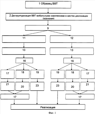 До начала деструктуризации обезвреженное в целом изделие подвергают рентгенофлуоресцентному анализу. Рентгенофлуоресцентный анализ изделия 1 в целом проводят до его разборки на детали путем последовательного точечного просвечивания узким рентгеновским лучом изделия по всему его объему, приема и измерения спектрального отклика материалов изделия, находящихся в корпусе изделия на пути распространения луча для получения распределения видов материалов, находящихся в корпусе изделия. Полученная объемная рентгенофлуоресцентограмма (спектрограмма) изделия используется далее для рационального раскроя (деструктуризации 2) изделия на составные элементы без повреждения частей изделия, содержащих цветные и драгоценные металлы. Деструктуризацию 2 изделия проводят путем плазменной (огненной) и механической резки кабин, корпусов, планеров, механизированной и/или ручной разборки на составные элементы 9-10 (агрегаты, двигатели, блоки, гидравлические, механические, электромеханические узлы). При необходимости производится дальнейшая разборка 13 элементов 9-10 на неделимые элементы. Затем элементы 9 или их неделимые элементы транспортом 14 перевозятся на ремонтно-диагностический центр 15, а механические и электромеханические узлы 10 – на соответствующие станции технического обслуживания (не показаны). В центре 15 с использованием диагностических комплексов производится диагностика 16 поступивших элементов на исправность и ремонтопригодность. При этом элементы сортируются на три группы: исправные 17, требующие ремонта 18 и неремонтопригодные 19. Аналогично на соответствующих контрольно-измерительных стендах диагностируются элементы 12 и затем сортируются на аналогичные группы по ремонтопригодности. Элементы 18, требующие ремонта, ремонтируются 20 с соответствующим обновлением внешнего вида путем окрашивания и пайки. Исправные элементы 17 проходят подготовку 21, включая чистку и окрашивание.