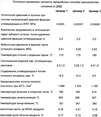 Как видно, в отличие от известного способа переработки отходов производства изопрена – высококипящих побочных продуктов ректификации ДМД предлагаемым способом достигают более глубокого извлечения ценных углеводородов и получение тяжелого остатка с высокой температурой вспышки, что позволяет существенно расширить область его использования.
