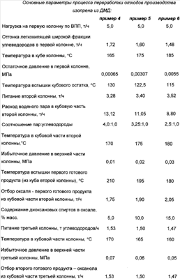 Указанная задача решается тем, что в предлагаемом способе переработки отходов производства изопрена из 4,4-диметил-1,3-диоксана, заключающемся в разделении ректификацией высококипящих побочных продуктов, образующихся при синтезе 4,4-диметил-1,3-диоксана из изобутилена и формальдегида в присутствии кислотного катализатора, выделенных из масляного и водного слоев и являющихся кубовым остатком ректификации 4,4-диметил-1,3-диоксана, используемого для получения изопрена разложением на кальцийфосфатном катализаторе, включающем предварительное удаление под вакуумом из высококипящих побочных продуктов в первой колонне легкокипящей широкой фракции углеводородов и последующую отгонку углеводородов из оставшегося кубового продукта первой колонны в процессе его обработки острым водяным паром, отгонку легкокипящей широкой фракции углеводородов в первой колонне проводят при остаточном давлении 0,00065-0,0055 МПа в верхней части колонны с выдерживанием температуры вспышки оставшегося в первой колонне кубового продукта в пределах 115-130°С путем изменения температуры в кубовой части первой колонны в интервале 165-185°С, кубовый продукт первой колонны направляют во вторую колонну на перегонку с острым водяным паром, причем массовое соотношение водяной пар:углеводороды выдерживают 2,5-4,0:1,0 при избыточном давлении во второй колонне 0,01-0,03 МПа, первый готовый продукт – оксаль выводят из второй колонны с температурой вспышки 180-210°С, отогнанные из верхней части второй колонны пары углеводородов и воды после конденсации подают в третью колонну и при избыточном давлении в верхней части колонны 0,05-0,07 МПа погон колонны, состоящий в основном из водяных паров, возвращают в верхнюю часть второй колонны, избыток после конденсации подают на биологическую очистку, полученные в кубовой части третьей колонны диоксановые спирты – оксанол выводят в виде второго готового продукта. Отогнанную в первой колонне легкокипящую широкую фракцию углеводородов после конденсации направляют на каталитическое разложение высококипящих побочных продуктов, избыток легкокипящей широкой фракции углеводородов подают в рецикл процесса синтеза 4,4-диметил-1,3-диоксана.