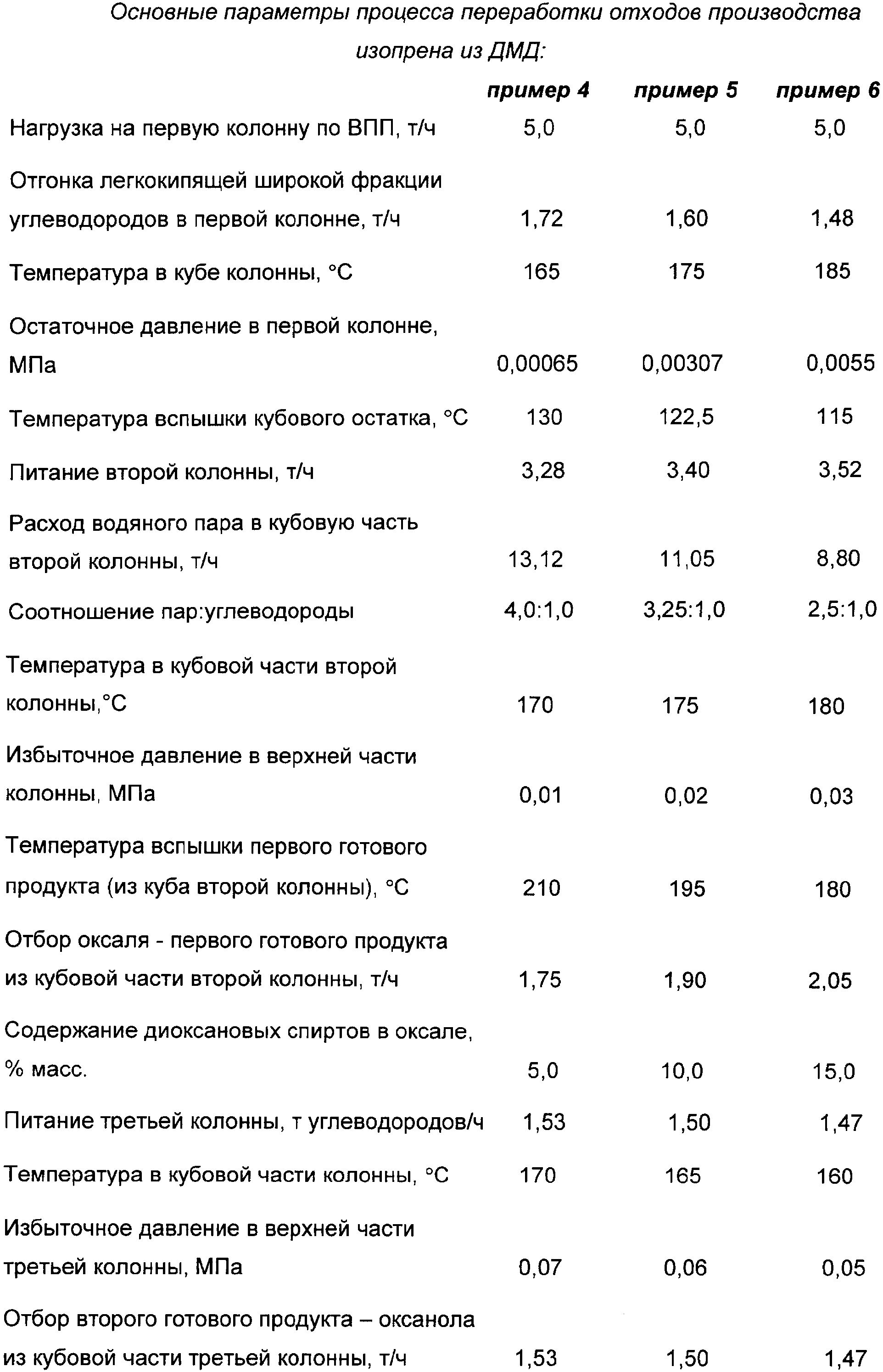 1. Способ переработки отходов производства изопрена из 4,4-диметил-1,3-диоксана, заключающийся в разделении ректификацией высококипящих побочных продуктов, образующихся при синтезе 4,4-диметил-1,3-диоксана из изобутилена и формальдегида в присутствии кислотного катализатора, и выделенных из масляного и водного слоев и являющихся кубовым остатком ректификации 4,4-диметил-1,3-диоксана, используемого для получения изопрена разложением на кальций-фосфатном катализаторе, включающий предварительное удаление под вакуумом из высококипящих побочных продуктов в первой колонне легкокипящей широкой фракции углеводородов и последующую отгонку углеводородов из оставшегося кубового продукта первой колонны в процессе его обработки острым водяным паром, отличающийся тем, что отгонку легкокипящей широкой фракции углеводородов в первой колонне проводят при остаточном давлении 0,00065-0,0055 МПа в верхней части колонны с выдерживанием температуры вспышки оставшегося в первой колонне кубового продукта в пределах 115-130°С путем изменения температуры в кубовой части первой колонны в интервале 165-185°С, кубовый продукт первой колонны направляют во вторую колонну на перегонку с острым водяным паром, причем массовое соотношение водяной пар: углеводороды выдерживают равным 2,5-4,0:1,0 при избыточном давлении во второй колонне 0,01-0,03 МПа, первый готовый продукт-оксаль выводят из второй колонны с температурой вспышки 180-210°С, отогнанные из верхней части второй колонны пары углеводородов и воды после конденсации подают в третью колонну и при избыточном давлении в верхней части колонны 0,05-0,07 МПа погон колонны, состоящий в основном из водяных паров, возвращают в верхнюю часть второй колонны, избыток после конденсации подают на биологическую очистку, полученные в кубовой части третьей колонны диоксановые спирты – оксанол выводят в виде второго готового продукта.