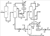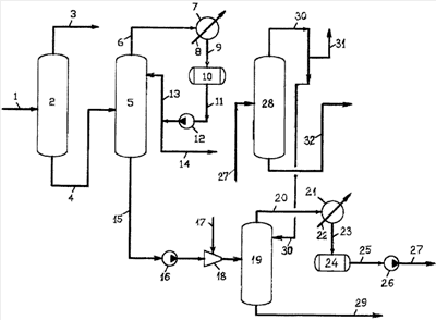 В третьей колонне 28 при температуре в кубовой части 160-170°C и избыточном давлении в верхней части колонны 0,05-0,07 МПа погон колонны, состоящий в основном из водяных паров, возвращают в верхнюю часть второй колонны 19 по линии 30, а избыток по линии 31 после конденсации (не показано) выводят на биологическую очистку.