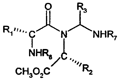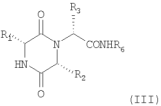 и изоцианид CNR6 (VIII), в котором R6 представляет собой 2-бензилоксифенильную группу, в растворителе, таком как трифторэтанол. Заместитель R2 представляет собой 1-метилпропильную группу, и соединения формулы (I), в которых R1 представляет собой 1-метилпропильную группу, имеющую (S)- или (R)-конфигурацию, могут быть получены, исходя из сложного аминоэфира (V), в котором R2-группа имеет требуемую (S)- или (R)-конфигурацию. Последующие примеры являются иллюстративными, но не ограничивающими вариантами осуществления настоящего изобретения. Основные способы очистки и анализа Аналитическую ВЭЖХ проводили на Supercosil LCABZ+PLUS колонке (3,3 см × 4,6 мм ID), при элюировании 0,1% HCO2H и 0,01 М ацетатом аммония в воде (растворитель А), и 0,05% HCO2H 5% воды в ацетонитриле (растворитель В) при использовании градиента элюирования 0-0,7 минут 0% В, 0,7-4,2 минуты 0%-100% В, 4,2-5,3 минут 100% В, 5,3-5,5 минут 0% В при скорости потока 3 мл/минуту. Масс-спектры регистрировали на Fision VG Platform спектрометре с использованием электрораспыления положительных ионов [(ES+ve с получением МН+ и М(NH4)+ молекулярных ионов] или электрораспыления отрицательных ионов [(ES-ve с получением (М-Н)– молекулярного иона] на Micromass series 2 или Waters ZQ масс спектрометре. 1Н-ЯМР спектры регистрировали при использовании Bruker DPX 400 МГц спектрометра при использовании тетраметилсилана в качестве внешнего стандарта. BiotageTM хроматография относится к очистке с использованием оборудования, поставляемого Dyax Corporation (или Flash 40i, или Flash 150i), и картриджей, заполненных KPSil. Автоматическая подготовка образцов для масс-спектроскопии относится к способам, в которых вещество очищали высокоэффективной жидкостной хроматографией на HPLCABZ +5 мкм колонке (5 см × 10 мм i.d.) с 0,1% HCO2H в воде и 95% MeCN, 5% воды (0,5% HCO2H) с использованием градиента элюирования при скорости потока 8 мл в минуту. Gilson 202-фракционный коллектор инициировали VG Platform масс-спектрометром при определении интересующей массы. Гидрофобные фритты относятся к фильтрационным трубкам, поставляемым Whatman. SPE (твердофазная экстракция) относится к использованию картриджей, поставляемых International Sorbent Technology Ltd. ТСХ (TLC) (тонкослойная хроматография) относится к использованию пластинок для ТСХ, поставляемых Merk, покрытых силикагелем 60 F254. OasisTM относится к картриджам Waters® OasisTM для HLB экстракции, поставляемым Waters Corporation®. Промежуточный продукт 1 2-{(3R,6R)-3-(2,3-дигидро-1Н-инден-2-ил)-6-[(1S)-1-метилпропил]-2,5-диоксо-1-пиперазинил}-N-(2-гидроксифенил)-2-(2-метил-1,3-оксазол-4-ил)ацетамид К энергично перемешиваемому раствору гидрохлорида сложного метилового эфира (D)-аллоизолейцина (5,0 г) в дихлорметане (150 мл) добавляли насыщенный раствор бикарбоната натрия (150 мл). Полученный двойной слой разделяли с использованием гидрофобной фритты и водную фазу дважды промывали дихлорметаном (50 мл). Объединенную дихлорметановую фазу разбавляли метанолом (200 мл), добавляли (2R)-[(бензилоксикарбонил)амино](2,3-дигидро-1Н-инден-2-ил)этановую кислоту (14,64 г) и смесь энергично перемешивали в течение 1 часа до получения раствора. Раствор упаривали и остаток растворяли в смеси 1:1 трифторэтанол/метанол (140 мл), затем добавляли 2-бензилоксифенилизоцианид (9,43 г) с последующим добавлением 2-метил-4-формилоксазола (5,0 г) и реакцию перемешивали в течение 4 дней при комнатной температуре. Смесь испаряли, и остаток растворяли в этаноле (500 мл), и добавляли палладий на угле (4,0 г) и уксусную кислоту (10 мл