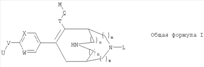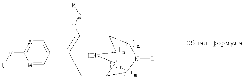 3. Соединения общей формулы I по п.1, в которой X, W, V, U, L, М, m и n имеют значения, указанные в п.1, а Т обозначает-CONR1; Q обозначает метилен; и оптически чистые энантиомеры, смеси энантиомеров, такие как рацематы, диастереоизомеры, смеси диастереоизомеров, диастереоизомерные рацематы, смеси диастереоизомерных рацематов и мезоформа; а также фармацевтически приемлемые соли и комплексы с растворителями.