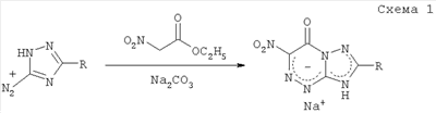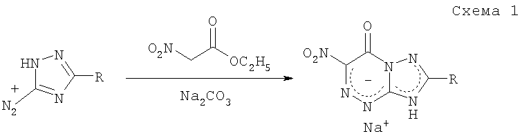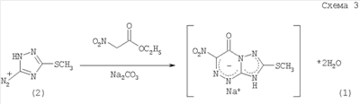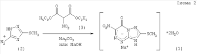 1. Область техники, к которой относится изобретение Изобретение относится к области биологически активных соединений и касается способа получения натриевой соли 2-метилтио-6-нитро-1,2,4-триазоло[5,1-с]-1,2,4-триазин-7-она, дигидрата, обладающего противовирусным действием, предназначенного для лечения и профилактики инфекционных заболеваний животных и человека. Изобретение может быть использовано в химико-фармацевтической промышленности, лечебных учреждениях, научно-исследовательских лабораториях, а также в животноводстве и птицеводстве. 2. Уровень техники Описан единственный способ получения натриевых солей 2-R-6-нитро-1,2,4-триазоло[5,1-с]-1,2,4-триазин-7-онов взаимодействием солей 3-R-1,2,4-триазол-5-ил-диазония с этилнитроацетатом в присутствии карбоната натрия при 0-25°С (Синтез нитропроизводных азоло[5,1-с][1,2,4]триазина. В.Л.Русинов, А.Ю.Петров, И.Я.Постовский. / Химия гетероциклических соединений. – 1980. №9. С.1283-1285; Синтез и противовирусная активность 6-нитро-7-оксо-4,7-дигидроазоло[5,1-с][1,2,4]триазинов. В.Л.Русинов, Е.Н.Уломский, О.Н.Чупахин, М.М.Зубаиров, А.Б.Капустин, Н.И.Митин и др. / Химико-фармацевтический журнал. – 1990. №9. С.41-44). Выход натриевых солей составляет 53-80% (схема 1). Недостатком способа являются недостаточно высокий в некоторых случаях выход целевых продуктов, а также труднодоступность ключевого реагента – этилнитроацетата, получаемого по одному из нескольких синтетических способов. Одним из способов синтеза этилнитроацетата является нитрование ацетоуксусного эфира ацетилнитратом с выходом 27-47% (Journal of the Chemical Society, 1958, p.2276-82, Bulletin de la Societe Chimique de France, 31, 847-854; 1904). Недостатками метода являются низкий выход продукта, взрывоопасность ацетилнитрата. По другому способу этилнитроацетат получают этерификацией дикалиевой соли нитроуксусной кислоты (Org. Synth., V 55, p.77, Деп. №131 хп-Д81. – Л. 1981, Helvetica Chimica Acta, 2002, v.85, №12, p.4468-4484). К существенным недостаткам метода относятся не только небезопасность и нестабильность ключевого интермедиата – нитроуксусной кислоты, но и низкая температура реакции (-10°С). Эфиры нитроуксусной кислоты образуются также при обработке алкилиод- и алкил-бромацетатов нитритом серебра или анионообменными смолами (Amberlyst А 26) в форме нитритов (Organic Letters, 4(6), 965-968; 2002). Необходимость использования нитрата серебра или ионообменных смол является существенным недостатком метода, исключает масштабное применение этого метода в промышленности. Наиболее простым и надежным является многостадийный синтез этилнитроацетата нитрозированием этилацетоацетата и последующим окислением этил 2-гидроксимино-3-оксобутаноата (Органические реакции, сб.7, перевод под ред. Ю.А.Арбузова, Н.К.Кочеткова, А.Ф.Платэ, М.: Издательство иностранной литературы, 1956, 552 с., Синтезы органических соединений, сб.1 под ред. А.Н.Несмеянова, П.А.Боброва. М-Л.: Издательство Академии наук СССР, 1950, 166 с.) с суммарным выходом 38-46%. Недостатком метода является использование агрессивных окислителей, большое количество стоков и взрывоопасность стадии перегонки этилнитроацетата. В качестве СН-кислотной компоненты – азосоставляющей в реакции с солью 3-метилтио-1,2,4-триазол-5-ил-диазония для получения 2-метилтио-6-нитро-1,2,4-триазоло[5,1-с]-1,2,4-триазин-7-она, дигидрата, обладающего противовирусным действием, возможно использование диэтилнитромалоната, но такие реакции с солями азолилдиазония с п