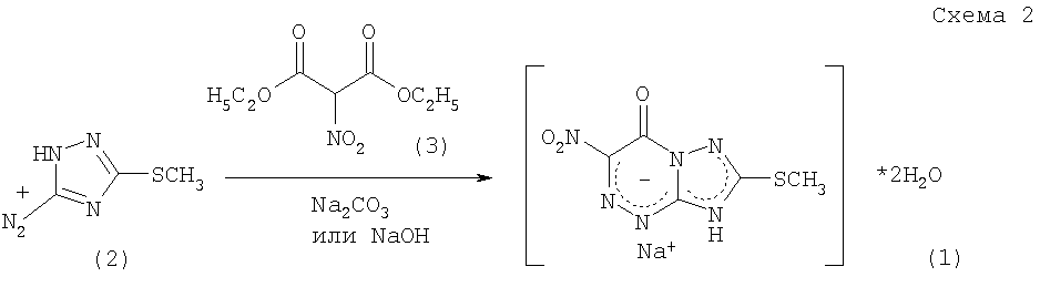 Способ получения натриевой соли 2-метилтио-6-нитро-1,2,4-триазоло[5,1-с]-1,2,4-триазин-7-она, дигидрата формулы (1) заключающийся в том, что соль 3-метилтио-1,2,4-триазолил-5-диазония подвергают взаимодействию с диэтилнитромалонатом в присутствии карбоната или гидроксида натрия при 0-25°С в водно-спиртовой среде.