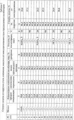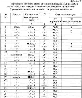 Произведение указанных величин составляет 35,5, т.е. почти в 2,5 раза меньше, чем экспериментальная величина 333, что как и в случае стали, свидетельствует о взаимном усилении защитных свойств компонентов ингибитора. Известный ингибитор тормозит коррозию алюминия в значительно меньшей мере, степень защиты составляет 41,9%, для предлагаемого 99,7%. Пример III. В качестве примера торможения коррозии никеля приводятся данные для 3 н. H2SO4 при концентрации ингибитора, как и в примере I. Опыты проводились при 20°С (60 час) и при 90°С (0,5 часа). В растворе с предлагаемым ингибитором степень защиты составляет 79,1% (20°С) и 79,2% (90°С), с известным соответственно 31,8 и 33,7%. Итак, совокупность данных, собранных в таблицах 1 и 2, а также в примерах 1-3, однозначно указывает на превосходство предлагаемого ингибитора по сравнению с известным по торможению коррозии для стали, алюминия и никеля в серной и хлороводородной кислотах. Еще значительнее преимущество предлагаемого ингибитора по замедлению наводороживания стали. В дополнительных опытах было показано, что предлагаемый ингибитор более эффективно защищает сталь в кислой среде, чем широко применяемый в производственной практике ингибитор ПБ-5 (так, последний замедляет коррозию стали в 10-20 раз, в то время как предлагаемый – в 20-100 раз). Кроме того, предлагаемый ингибитор, в отличие от ПБ-5, не коагулирует при накоплении в травильном растворе ионов железа. Повышение защитных свойств предлагаемого ингибитора связано с усилением ингибиторной активности за счет взаимного синергического действия компонентов. Предлагаемый ингибитор может быть рекомендован для травления стали, алюминия и никеля в кислых средах, для кислотных очисток оборудования в энергетике и пищевой промышленности, а также при кислотных промывках скважин в газо- и нефтедобыче.