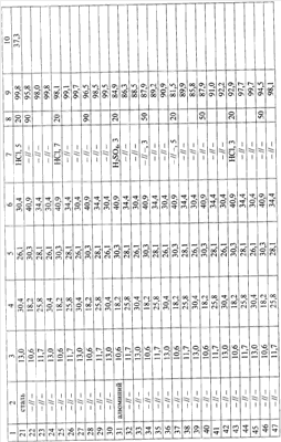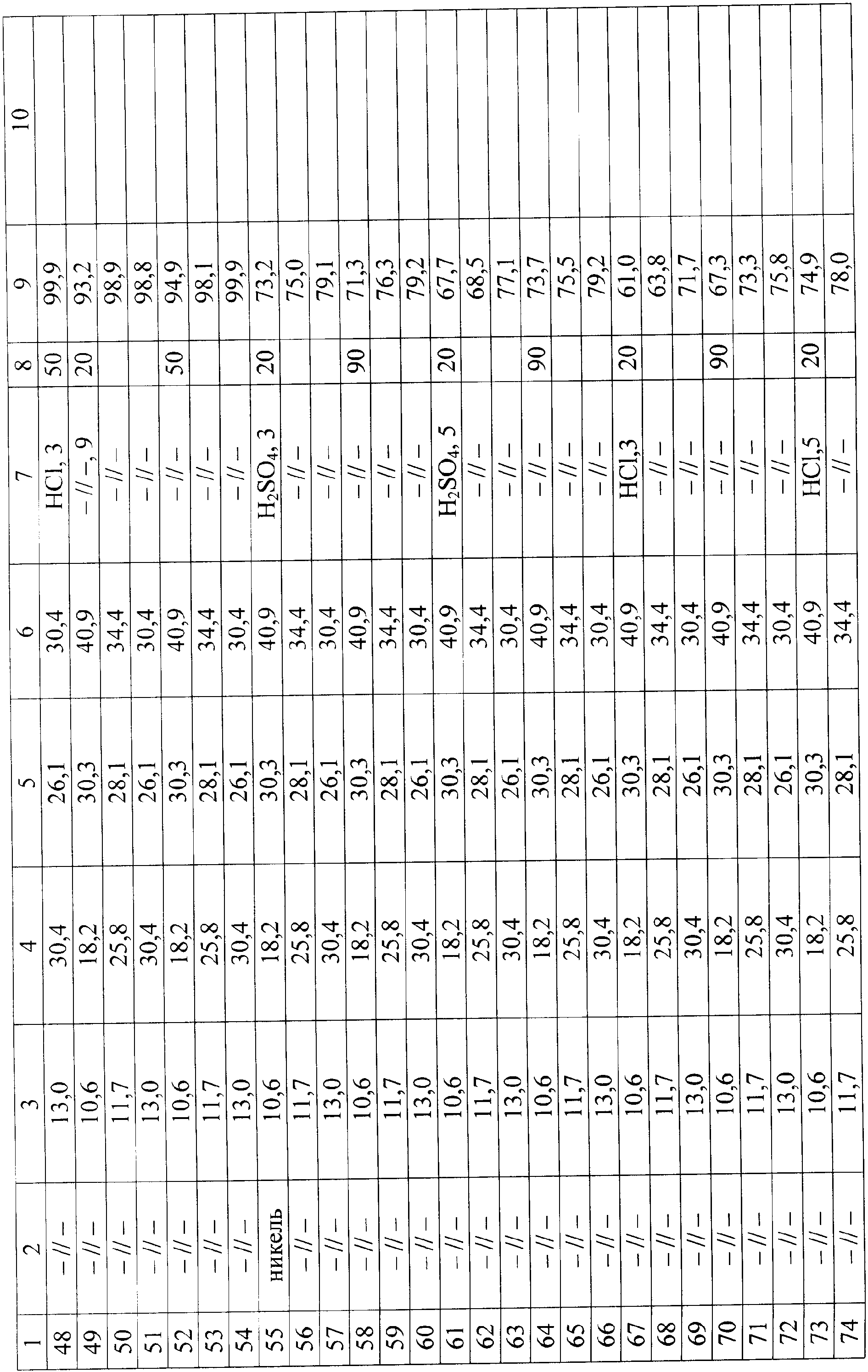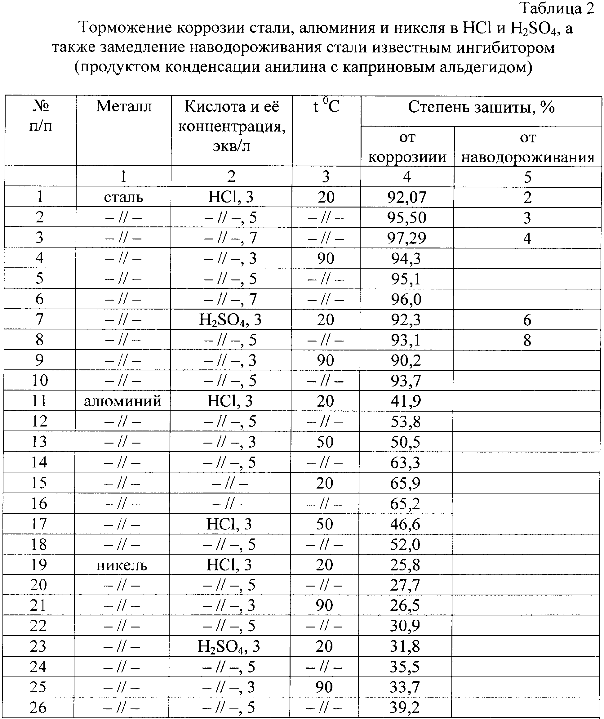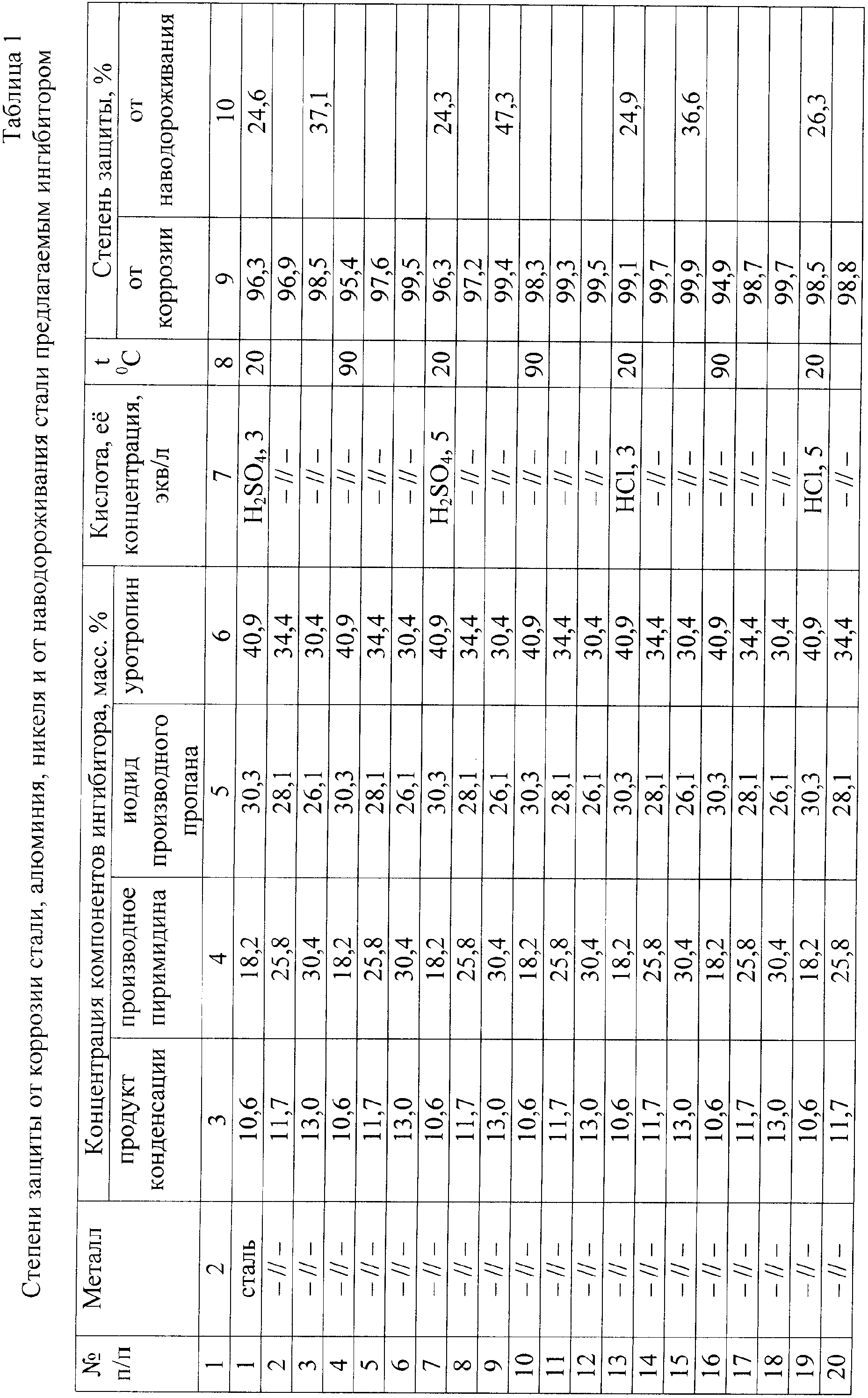 В скобках указаны концентрации компонентов, выраженные в г/л. При приготовлении ингибированного раствора кислоты следует в первую очередь ввести в кислоту продукт конденсации (азометин) и тщательно перемешать раствор. Остальные компоненты можно растворять в любой последовательности. Результаты коррозионных испытаний образцов стали, алюминия и никеля в растворах кислот с предлагаемым ингибитором приводятся в таблице 1 и примерах. Для известного ингибитора данные содержатся в таблице 2 и тех же примерах. Экспериментальные результаты получены как гравиметрическим методом (по убыли массы образцов), так и объемным (по объему выделившегося водорода). Водородная хрупкость (наводороживание) стали определялась с применением машины К-5 по числу оборотов образцов стали до излома без предварительного травления и после него в чистых и ингибированных растворах кислот. Степени защиты от наводороживания, как и от коррозии приводятся в таблицах и примерах. Пример I. Опыты со стальными образцами проводились в 500 мл 3 н. серной кислоты при 20±1 и 90±1°С (температура поддерживалась с помощью жидкостного термостата). Ингибитор брался в концентрации 6,6 г/л, концентрации компонентов при этом составляют: азометин (продукт конденсации) 10,6; производное пиримидина 18,2; гидроиодид 30,3; уротропин 40,9 мас.%. Опыты проводились в трехкратной повторности с образцами, имеющими размер 50×25×1 мм. Образцы обрабатывались наждачной бумагой, обезжиривались ацетоном, помещались на 2 часа в эксикатор над прокаленным хлоридом кальция и затем взвешивались на аналитических весах. После опыта образцы промывались водой, протирались бумажной салфеткой, высушивались в эксикаторе и вновь взвешивались. По убыли массы образцов определялась скорость коррозии стали. Для 20°С она составила 9,58·10-4 г/дм2/час (в растворе без ингибитора) и 14,44·10-6 г/дм2·час (с ингибитором). При 90°С скорость коррозии 25,71 г/дм2·час (без ингибитора) и 0,13 г/дм2·час. Длительность опыта составляла при 20°С 60 час, при 90°С 0,5 час. Затем были рассчитаны коэффициенты торможения: для 20°С – 66,6 (степень защиты 98,5%) и для 90°С – 200 (степень защиты 99,5%). Во второй серии опытов образцы испытывались в 5 н. растворе Н2SO4, с введением только одного компонента ингибитора. Найденные коэффициенты торможения соответственно составили (для тех же концентраций компонентов, что и в 1-й серии):