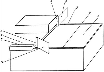 По ходу кладки на основание 4 подсобным рабочим подается укладываемый в версту кирпич. Кирпич лицевой гранью прижимается к боковому упору 5, а тычковой – к пластине 6. Равноценен вариант, показанный на чертеже, когда кирпич прижимается ложковой гранью к другому, симметрично расположенному боковому упору, а тычковой гранью – к вертикальной кромке пластины 8. Каменщик кельмой наносит раствор на тычковую грань кирпича, выравнивая его по толщине прижатием одной из пластин 7 или 9, после чего снимает кирпич с основания 4 и укладывает в версту. По мере расходования раствора, содержащегося в растворном ящике 1, основание 4 посредством направляющих 2 и 3 перемещается вдоль растворного ящика 1 к тому месту, где имеется раствор.