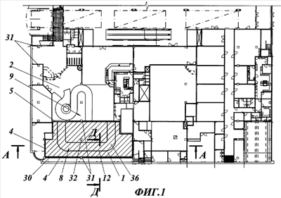 Часть ограждений танка 4 конструктивно и функционально совмещена или объединена с ограждающими 30 и/или несущими конструкциями здания, такими как колонны 31 здания. Танк содержит внутри своего периметра, по меньшей мере, одну колонну 32, которая является общим конструктивным элементом танка и здания, в котором размещен танк.