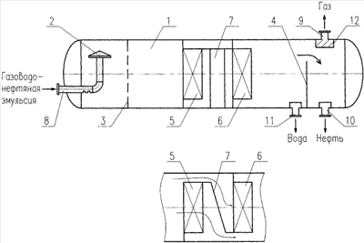 Расслоенная в подводящем трубопроводе (на чертеже не показан) исходная продукция скважин – газожидкостная смесь – поступает в сепаратор 1 через тарельчатый ввод 2 и плавно подается на верхний уровень жидкой фазы, далее равномерно распределяется по сечению аппарата выравнивающей перегородкой 3. После прохождения выравнивающей перегородки 3 поток делится на два параллельных потока за счет одинакового гидравлического сопротивления каждого пакета насадок 5 и 6. Один из параллельных потоков проходит через первый по ходу движения газожидкостной смеси пакет коалесцирующих насадок 5, другой поток проходит через вертикальную перегородку 7, а затем через последовательно установленный пакет коалесцирующих насадок 6, т.е. обеспечивается параллельная работа пакета насадок. Далее поток проходит зону осаждения и отстоя. Нефть поднимается вверх и далее через перегородку 4 поступает в секцию сбора нефти и через патрубок 10 отводится из сепаратора. Вода накапливается до перегородки 4 в нижней части отстойной зоны и отводится из сепаратора через патрубок 11 отвода воды. Газ проходит выравнивающую перегородку 3, далее очищается в пакете коалесцирующих насадок 5 и 6 от крупных капель жидкости. В зоне выхода газ окончательно очищается от жидкости каплеулавливающей насадкой 12 и выходит из сепаратора через патрубок 9.