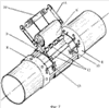 Конструктивная часть устройства, предназначенная для осуществления собственно бандажирования (фиг.2), содержит кольцевой ротор 8, установленный на дефектном месте трубы с расположенным на нем рулонодержателем 9 с подготовленной заготовкой, бобину 10 приема использованных шнуров, соединенную с приводом вращения заготовки гибкой связью 11, прижимной и прикаточный ролики 12 и скребки-отсекатели 13.