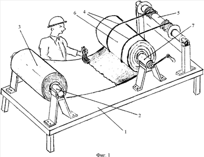 На фиг.1 изображено устройство для ремонта трубопровода путем бандажирования, содержащее конструктивную часть, предназначенную для формирования заготовки для бандажирования, включающую платформу 1 с отдающей шпулей 2 с размещенной на ней лентой гибкого рулонированного стеклопластика 3, на внутреннюю поверхность которого нанесен клеевой состав и уложены изолирующие прокладки в виде шнуров 4, сматываемых с бобины 5. Полученная для бандажирования заготовка 6 размещена на приемной шпуле 7. Оборудование расположено на суше.