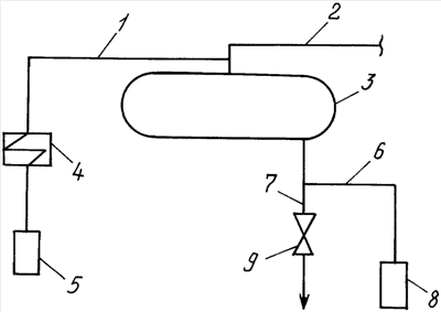 Схема определения относительной влажности пара содержит линию 1 отбора пробы пара, подключенную к паропроводу 2, соединенному с верхней зоной парового пространства парогенератора 3, холодильник 4 и пробоотборник 5, линию 6 отбора пробы котловой воды, подключенную к трубопроводу 7 непрерывной продувки, который подключен к солевому отсеку парогенератора 3, и пробоотборник 8. Автоматические анализаторы натрия с проточной ячейкой, например, типа Soditrace (с диапазоном измерения 0,001÷10000 мкг/л) или AMI Sodium Р (с диапазоном измерения 0,1÷10000 мкг/л) фирмы SWAN (Швейцария) (не показано) подключают соответственно к пробоотборникам 5 и 8.