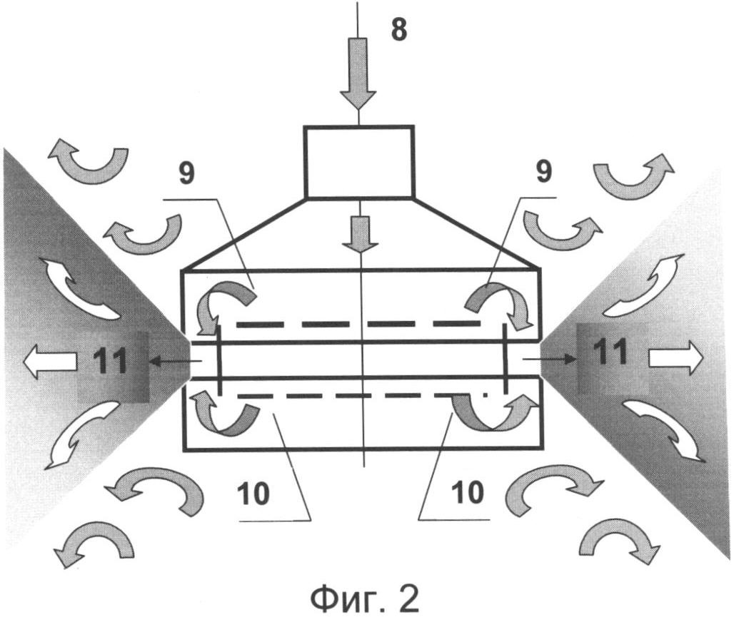 На фиг.2 представлена схема движения потоков воздуха внутри конструкции и снаружи.