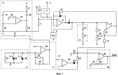 Устройство сжатия на операционных усилителях 18 и 16 и фильтрация Г-образным RC-фильтром 14 низкочастотных помех от ударного механического воздействия и воздействия температуры обеспечивают расширение динамического диапазона сверху и снизу и повышение помехоустойчивости. Это обеспечивает выделение коротких импульсов пассивного датчика 1 излучения.