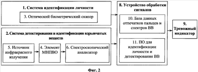 Особенностью предлагаемого изобретения, отличающей его от известной, принятой за прототип системы, является то, что в системе идентификации личности используют оптический биометрический сканер, причем прозрачное основание, установленное на его рабочей поверхности, выполнено в виде элемента МНПВО. Элемент МНПВО представляет собой плоскопараллельную пластину со скошенными боковыми гранями: входной и выходной, выполненную из оптического материала, имеющего коэффициент преломления больший, чем у материала, из которого изготовлена призма оптического сканера. Материал пластины пропускает излучение в диапазоне, соответствующем спектрам поглощения идентифицируемых веществ, а также излучение, на котором работает биометрический сканер. Источник излучения выполнен с возможностью установки перед входной скошенной боковой гранью элемента МНПВО, при этом он испускает излучение в диапазоне, соответствующем спектрам поглощения идентифицируемых веществ. Спектроскопический анализатор системы обнаружения взрывчатых веществ в отпечатках пальцев методом спектроскопии МНПВО может быть выполнен в виде дифракционного полихроматора с многоканальным приемником ИК-излучения, либо в виде опто-акустического перестраиваемого фильтра с одноканальным приемником ИК-излучения.