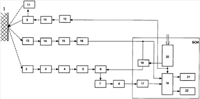 Устройство работает следующим образом. После нажатия кнопки начала измерений, располагающейся на пульте управления 20, на генератор импульсного питания 12 и систему регистрации 19 подается запускающий сигнал. Импульсы напряжения от генератора импульсного питания 12 поступают на лазерный излучатель 10, на выходе которого формируется пучок лазерного излучения, направляемый на светоделительное устройство 9. Пучок излучения с первого выхода 9 направляется на изображение полевой диафрагмы приемной оптической системы 2 радиометрического канала. Излучение лазера со второго выхода 9 отклоняется на 90° и направляется на формирующую оптическую систему 11. Линейное расстояние между светоделительным устройством 9 и формирующей оптической системой 11 образует стереобазу для контроля осевого смещения прибора относительно сопряженной плоскости. С выхода ФОС 11 излучение направляется на то же изображение полевой диафрагмы. При правильной ориентации прибора на объекте контроля 1 наблюдается одна точка засветки лазерным излучением, которая должна быть направлена на интересующую зону контроля. В случае наличия осевого смещения визируемая точка раздваивается, что указывает на необходимость корректировки осевым смещением прибора относительно объекта. Диффузная компонента лазерного излучения отраженная от биологического объекта 1 попадает на ПОСЛИ 13, после которого направляется на второй приемник излучения 14. Благодаря тому, что лазерный излучатель 10 работает в импульсном режиме, фотометрический канал защищен от фонового излучения, а усилитель 15 этого канала работает на рабочей частоте генератора импульсного питания 12. Сигнал постоянного тока после усилителя-преобразователя 15 поступает на АЦП 16, где преобразуется в цифровой вид и направляется на вход блока обработки информации (БОИ). Собственное инфракрасное излучение биологического объекта поступает на вход приемной фокусирующей оптической системы 2 и направляется на ППИ 3, где преобразуется в импульсный поток излучения, затем в ПСХ 4 происходит подавление излучения в видимой области спектра для обеспечения защиты от фонового излучения. Размеры выделяемой области поверхности биологического объекта 1 определяются полевой диафрагмой, располагаемой в ППИ 3, и параметрами ПФОС 2. Импульсный поток излучения после ПСХ 4 поступает на первый приемник излучения 5, где преобразуется в напряжение электрического сигнала и поступает на функциональный преобразователь 6, коэффициент передачи которого изменяется в соответствии с сигналом, приходящим на его управляющий вход с выхода ПК 18. Второй преобразователь кода 18 является многотабличным преобразователем. В зависимости от типа поверхности биологического объекта 1, с помощью пульта управления 20 выбирается нужная таблица связи коэффициента отражения, величина которого представлена на выходе АЦП 16, и значением поправки, необходимой для компенсации погрешности измерений, возникающей вследствие изменения коэффициента излучения объекта 1. Сигнал с выхода ФПК 6 поступает на вход усилителя постоянного тока 7, где усиливается до необходимого уровня и преобразуется в сигнал постоянного тока, который в дальнейшем поступает на первый аналого-цифровой преобразователь 8 и далее на первый преобразователь кодов 17. Сигнал на выходе ПК 17 соответ