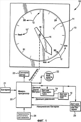 Микропроцессор 20 также может управляться для легкого и автоматического изменения величины перемещения указателя 15, зависящего от показаний давления от преобразователя 19 для согласования различных циферблатов 11, или различных наборов индексов 12, 12′ на циферблате 11. Например, если должна быть считана высота (непосредственно относящаяся к давлению окружающей среды), а не барометрическое давление, в заданной точке на Земле, то микропроцессор 20 активирует двигатель 22 (подавая энергию от батареи 21) другим образом. Также в таких обстоятельствах может быть подставлен другой тип преобразователя 19 давления.