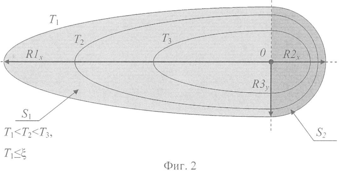 Затем, увеличив заданное значение избыточной температуры Тзад в два раза, повторяют вышеописанные процедуры измерения. В результате определяют значение параметра F2, при котором выполняется вышеуказанное соотношение контролируемых избыточных температур, избыточные температуры поверхности TF2(x)i и TF2(y)j соответственно по осям x и y, a также расстояния R1x2, R2x2, R3y2. А искомые теплофизические свойства определяют по зависимостям, полученным на основании следующих рассуждений.