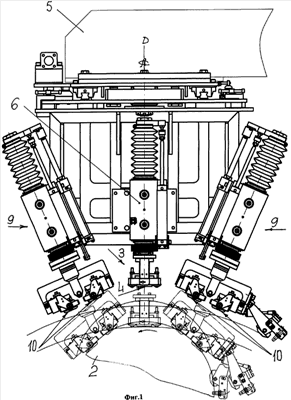 Фиг.1 – общий вид расположения преобразователей и устройства для слежения за сварным швом контролируемой трубы на раме установки УЗК;