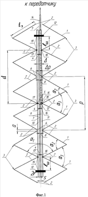 длина lш отрезков 19 двухпроводной линии 9 от мест 12 короткого замыкания до точек 17, 18 подсоединения ромбовидных элементов 1 крайних излучателей 3 решетки друг к другу – 0,234 lш 0,266 , такую же длину ln имеет отрезок 20 двухпроводной линии 9 (фиг.2) от точек 21, 22 подключения проводников коаксиального фидера 14 к линии 9 до точек 17, 18 подключения нижнего или верхнего излучателя 3 решетки, величина зазоров 4 в точках 17, 18 соединения пар 3 ромбовидных элементов 1 с трубчатыми проводниками 10, 11 двухпроводной линии 9 – =0,12 , a величине p зазоров 8 между проводниками 2 в месте их разрыва – 0,14  p 0,15 , расстояние а между разрывами проводников 2 смежных ромбовидных элементов 1 – а=0,03 ;