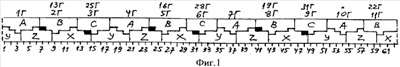 Для обмотки фиг.1 равновитковой (х=0) обмоточный коэффициент Kобо по коэффициентам укорочения Ку=sin(90°уk/ п) при yk=8, п=z/2p=93/11, распределения Кр=sin(60°)/Nsin60°/N равен Kобо=КуKp=0,82408; при х 0 к Кобо добавляется значение неравновитковости катушек, определяемое по фиг.2 при П=360°/z=60°/31:-х(0,664095-0,994869+0,528964)(1+2cos П+2cos2 П+2cos3 п)=-x1,38416-10Г+1Г+19Г+4Г+16Г+7Г+13Г, +x0,996436(cos0,5 п+cos1,5 п)=+х3,98290 для 22Г+31Г+25Г+28Г при Куi=0,664094 (yпi=13, i=1), 0,994869 (упi=9, i=3), 0,528964 (Упi=3, i=6), 0,996436 (y’пi=5, Г-3), Kобо N=51,0933 и x=+2,59874, тогда