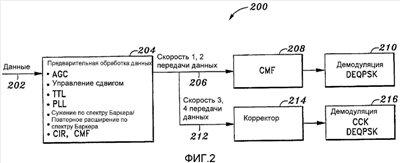 Фиг.2 иллюстрирует приемник 200, имеющий корректор с решающей обратной связью, согласно одному варианту осуществления, для обработки передачи данных, согласно стандарту 802.11b, на скорости 1, 2, 3 или 4 передачи данных. Приемник 200 может принять передачу 202 данных, например, исходящую из передатчика устройства беспроводной связи, такого как устройства 102a беспроводной связи, изображенного на Фиг.1, согласно стандарту 802.11b. Передача 202 данных может подвергнуться предварительной обработке данных в модуле 204 предварительной обработки данных, которая может включать в себя, например, автоматическую регулировку усиления (AGC), управление смещением, обработку цепи временного слежения (TTL), обработку цепи фазовой автоподстройки частоты (PLL), сужение по спектру и повторное расширение по спектру Баркера, оценку импульсной характеристики канала (CIR) и обработку согласованного фильтра канала (CMF), как известно в данной области техники. Затем данные 206 можно передать на скорости 1 и 2 передачи данных в блок 208 для обработки согласованного фильтра канала (CMF), а затем в блок 210 для демодуляции дифференциально-кодированной квадратурной фазовой манипуляции (DEQPSK), как известно в данной области техники. Данные 212, передающиеся на скорости 3 и 4 передачи данных, которые, согласно стандарту 802.11b, являются данными CCK, требуют коррекции и, таким образом, могут быть переданы на корректор 214 с решающей обратной связью после предварительной обработки данных в модуле 204. После обработки корректором 214 с решающей обратной связью CCK кодированные данные 212 могут быть переданы демодулятору 216 для CCK DEQPSK демодуляции на скорости 3 и 4 передачи данных.