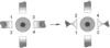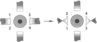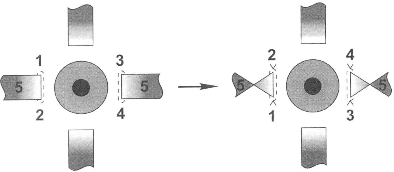 На чертеже место отсепаровки мышцы обозначено штрихполосой; цифрами 1, 2, 3, 4 обозначены «склеральные ушки» – участки склерального основания, используемые для фиксации к склере мышцы после ее ротации (перекручивания), цифрой 5 обозначены латеральная и медиальная прямые мышцы глаза. Вид до и после стрелки означает соответственно до и после ротации (перекручивания) прямых горизонтальных мышц.