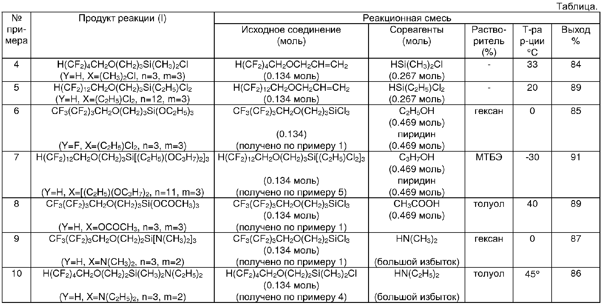 Изобретение относится к химической технологии кремнийорганических соединений. Техническая задача – синтез новых функциональных фторсодержащих кремнийорганических соединений и разработка технологичного способа их получения. Предложены соединения общей формулы YCF2(CF2)nCH2O(CH2)mSiX3, (I), где Y означает F или Н; n – целое число от 3 до 11; m равно 2 или 3; X означает одинаковые или различные группы, выбранные из ряда: Cl, СН3, С2Н5, ОСН3, ОС2Н5, ОС3Н7, ОС(O)СН3, NH2, N(H)CH3, N(CH3)2, N(C2H5)2. Предложен также способ получения заявленных кремнийорганических соединений, заключающийся в проведении реакции гидросилилирования аллилового эфира формулы YCF2(CF2)nCH2O(CH2)m-2CH=CH2, (II), где Y, n, m имеют вышеуказанные значения, соединением формулы HSiX3, где X означает одинаковые или различные группы, выбранные из ряда: Cl, СН3, С2Н5; или в проведении реакции гидросилилирования аллилового эфира формулы (II) соединением HSiClk(CH3)3-k, где k равно целому числу от 1 до 3, после чего проводят взаимодействие полученного соединения и соединения НХ, где X означает группы, выбранные из ряда: ОСН3, ОС2Н5, ОС3Н7, ОС(O)СН3, NH2, N(H)CH3, N(CH3)2, N(C2H5)2. Предложенные соединения могут найти промышленное применение в качестве модификаторов поверхностей с целью придания им нового комплекса свойств. 2 н. и 12 з.п. ф-лы, 1 табл., 5 ил.