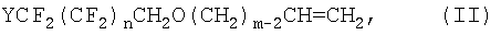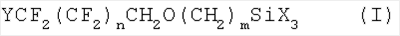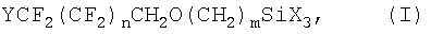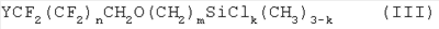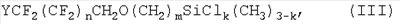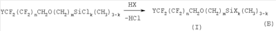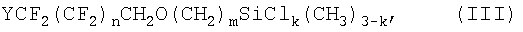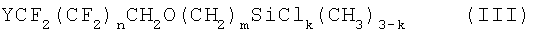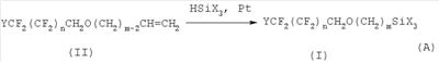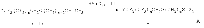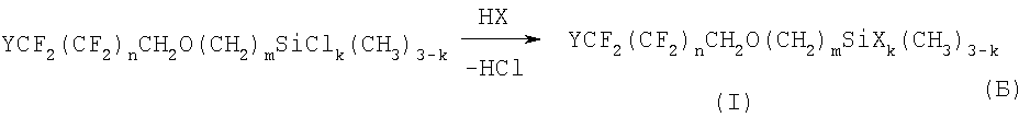 где Y, n и m имеют вышеуказанные значения, а Х означает одинаковые или различные группы, выбранные из ряда: ОСН3, OC2Н5, ОС3Н7, ОС(O)СН3, NH2, N(H)CH3, N(СН3)2, N(C2H5)2, проводят сначала реакцию гидросилилирования аллилового эфира формулы (II) соединением HSiClk(CH3)3-k, где k равно целому числу от 1 до 3, по схеме реакции (А) и затем осуществляют взаимодействие полученного соединения YCF2(CF2)nCH2O(CH2)mSiClk(CH3)3-k (III) и соединения НХ по схеме (Б):