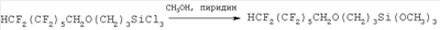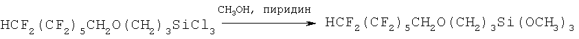 К 250 мл 13,1%-ного раствора (0.469 моль) пиридина в МТБЭ добавляют 18,86 мл (0.469 моль) метанола. Полученный раствор охлаждают до 0°С и добавляют 67,96 г (0.134 моль) Н(CF2)5СН2O(СН2)3SiCl3. Затем выдерживают реакционную массу при 40°С 3 часа. Все манипуляции проводят в атмосфере осушенного аргона. Летучие продукты удаляют в вакууме роторного испарителя. Целевой продукт выделяют перегонкой в вакууме. Ткип.=120°C (1 мм рт.ст.). ГЖХ – 97,22% чистоты. ЯМР-1Н: =0.67 м.д. (м. 2Н), =1.69 м.д. (м. 2Н), =3.56 м.д. (м. 11Н), =3.91 м.д. (т. 2Н), =5.83, 6.04, 6.25 м.д. (т. 1Н). Элементный анализ: найдено С 31.67%, Н 3.57%, F 46.07%, Si 5.58%, О 13,11%, вычислено С 31.58%, Н 3.67%, F 46.12%, Si 5.68%, О 12,95%.