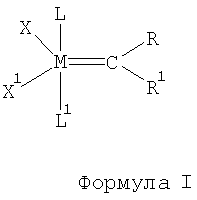 где М означает осмий или рутений, R и R1 независимо друг от друга означают атом водорода, остаток углеводорода, выбираемый из группы, включающей алкенильную группу с числом атомов углерода от двух до двадцати, алкинильную группу с числом атомов углерода от двух до двадцати, алкильную группу с числом атомов углерода от одного до двадцати, арильную группу, карбоксилатную группу с числом атомов углерода от одного до двадцати, алкоксигруппу с числом атомов углерода от одного до двадцати, алкенилоксигруппу с числом атомов углерода от двух до двадцати, алкинилоксигруппу с числом атомов углерода от двух до двадцати, арилоксигруппу, алкоксикарбонильную группу с числом атомов углерода от двух до двадцати, алкилтиольную группу с числом атомов углерода от одного до двадцати, алкилсульфонильную группу с числом атомов углерода от одного до двадцати и алкилсульфинильную группу с числом атомов углерода от одного до двадцати, Х и X1 независимо друг от друга означают любой анионный лиганд, L и L1 независимо друг от друга означают любой нейтральный лиганд, например это фосфины, амины, тиоэфиры, имидазолидинилидены или имидазолидины или же любой нейтральный карбин, в отдельных случаях L и L1 могут быть связаны друг с другом с образованием бидентатного нейтрального лиганда;